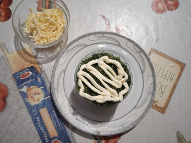 Завершающим слоем выложите натертый сыр. Закройте салат пищевой пленкой и поставьте в холодильник на 1 час, чтобы он пропитался.