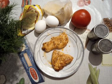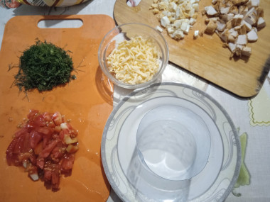 Калорийность продуктов: Куриные грудки, Яйца, Помидоры, Твёрдый сыр, Укроп, Соль, Перец черный молотый, Майонез