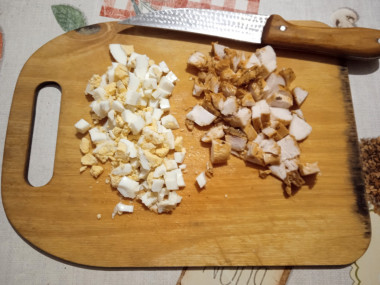 Готовую грудку остудите, нарежьте мелкими кубиками.