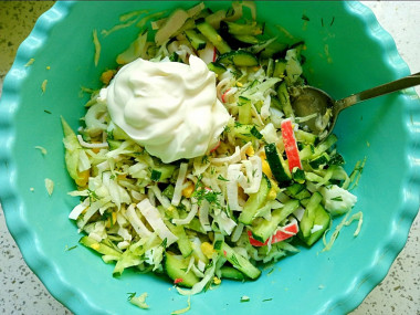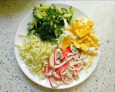 Капусту я немного помяла с солью для мягкости и чтобы сок появился. Огурцы, яйца и крабовые палочки нарезала соломой, как и капусту. Так салат смотрится более гармонично. Дополнительно добавила свежего укропа для аромата. Майонез взяла с низким содержанием жира.