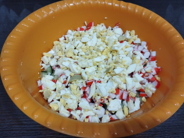 Каждую крабовую палочку освободите от упаковки, разрежьте вдоль напополам, затем кубиками. Следом нарежьте яйца. Переложите яйца и крабовые палочки в салатник.