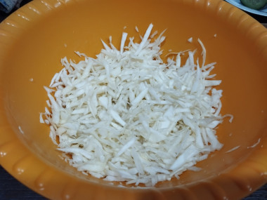 Капусту освободите от грязных верхних листьев. Тонко нашинкуйте капусту. Немного помните её руками, чтобы она стала мягче и быстрее пустила сок. Переложите капусту в салатницу.