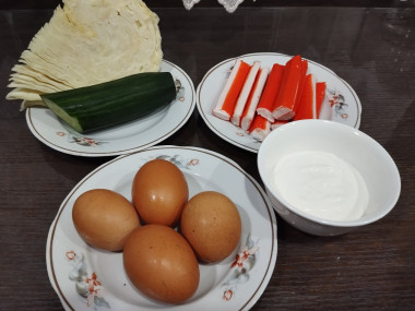 Как сделать салат с капустой крабовыми палочками и яйцами? Подготовьте для этого необходимые ингредиенты. Если у вас замороженные крабовые палочки, то заранее достаньте их из морозильной камеры и оставьте при комнатной температуре, чтобы они оттаяли. Огурцы можно взять 1-3 штуки, в зависимости от их размера и от вашего вкуса.