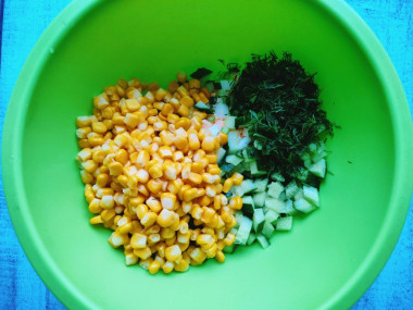 Кукурузу откиньте на сито и оставьте немного постоять, чтобы стекла вся жидкость. Сложите нарезанные огурцы, яйца и кукурузу в салатник. Посолите и поперчите салат по вкусу.