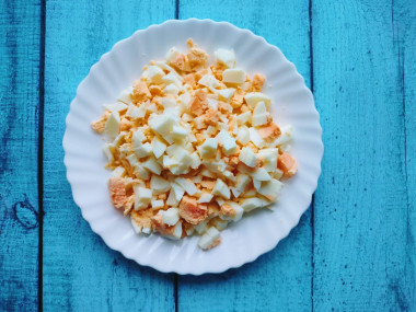 Как сварить яйца вкрутую? Чтобы яйца при варке не треснули, положите их в холодную воду и поставьте варить на небольшой огонь. Варите яйца 9 минут после закипания, затем залейте холодной водой и остудите. От резкого перепада температур скорлупа лучше очистится. Нарежьте очищенные яйца на кусочки такого же размера, как и огурец.