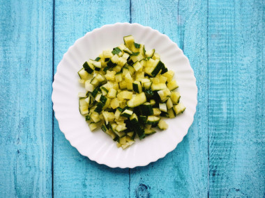 Огурцы помойте, обсушите, отрежьте кончики. Обязательно попробуйте огурцы на вкус, не горчат ли они — такие плоды испортят своим вкусом все блюдо. Нарежьте их на небольшие кусочки.