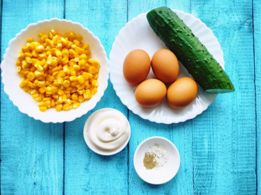 Как сделать салат из огурца, яиц, майонеза и кукурузы? Подготовьте продукты. Яйца отварите и остудите заранее. Огурцы у меня небольшого размера, по одному на порцию. Большой огурец потребуется один.