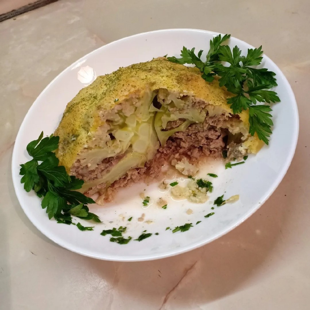 Этот кулинарный рецепт мне подсказала моя подруга, сторонница здорового питания. Правильное питание, совсем не означает «невкусно». Главное, готовить еду с душой и фантазией. Ярким блюдом такого питания является фаршированная цветная капуста. А приготовить ее совсем несложно, как может показаться. Небольшой кочан цветной капусты кладем в глубокую кастрюлю, полностью заливаем его водой и доводим до кипения на быстром огне, затем солим и на медленном огне варим около 10 минут. По истечении времени, перекладываем капусту в дуршлаг, чтобы стекла вода. Начинаем готовить фарш. Прокручиваем в мясорубке мясо с луковицей, разбиваем туда яйцо, измельченную зелень, а также соль и перец. Хорошо вымешиваем фарш. Остывшую цветную капусту наполняем фаршем, аккуратно заполняя все пустоты между соцветиями. Фаршировать капусту лучше руками, стараясь не нарушить ее форму. Нафаршированную цветную капусту перекладываем в форму для запекания, смазываем ее сметаной и посыпаем тертым сыром. Запекаем капусту в духовке, нагретой до температуры 220 градусов в течение 45 минут. Индикатором готовности служит появление золотистой корочки. Фаршированная цветная капуста очень ароматная и необыкновенно вкусная! Это блюдо украсит любой праздничный стол.