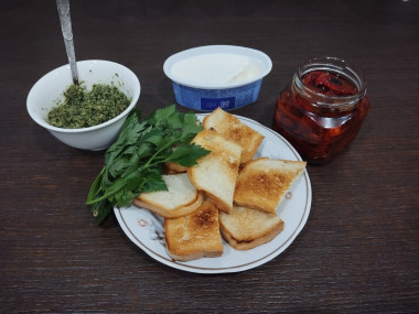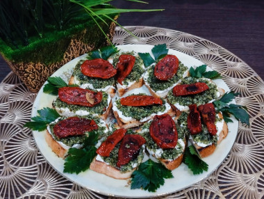 Угостили меня баночкой с вялеными помидорами. Зашла на сайт в поисках вкусного рецепта и я его нашла: брускетта с вялеными томатами. Тем более,и соус песто был( готовила для другого блюда).