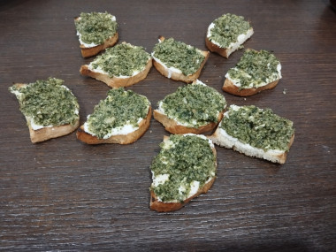 Ломтики батона предварительно обжарила на сухой сковороде с двух сторон до лёгкой хрустящей корочки. Смазала ломтики творожным сыром, сверху выложила соус песто и томаты(немного обсушила от масла).
