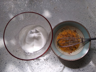 Яйца предварительно вымойте с чистящим средством для пищевых продуктов, так как на х поверхности могут быть вредные бактерии. Белки аккуратно отделите от желтков. В белки не должно попасть ни капли желтка, иначе они не взобьются. Белки уберите в холодильник.