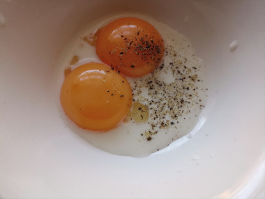 К желткам влейте молоко, добавьте смесь перцев и слегка взбейте вилкой. Специи вы можете взять любые, на ваш вкус.