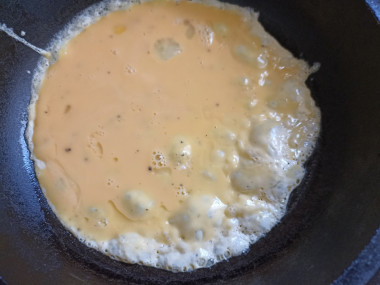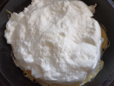 Как только желтки схватятся снизу, сверху выложите взбитые белки аккуратно разравняйте, чтобы не вылезали за пределы яичного блинчика.