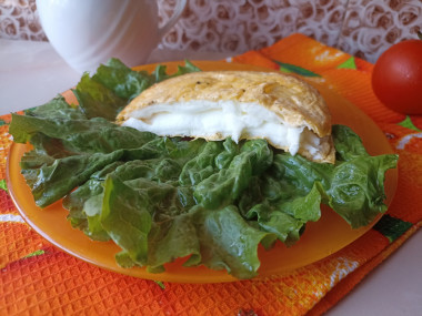 Разрежьте пополам и сложите белковой стороной внутрь. Нарежьте омлет порционными кусочками и подавайте к столу. Приятного аппетита!