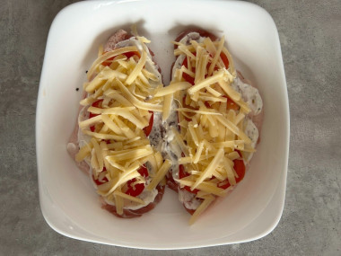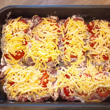 Сыр натрите на терке и посыпьте им каждый кусок мяса поверх помидоров. Поставьте форму в духовку, предварительно разогретую до 180 градусов, на 30-35 минут. Ориентируйтесь по своей духовке.