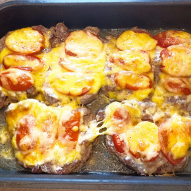 Решила приготовить стейки из свинины с сыром и помидорами в духовке. Делала все в точности как в рецепте. На запекание у меня ушло 30 минут и вкусные, сытные и красивые стейки готовы. Благодарю за данный рецепт.