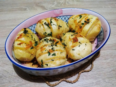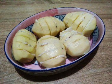 Тонким острым ножом сделайте продольные надрезы в каждой картошке. Расстояние между надрезами сделайте около 1 см. Не дорезайте клубни до самого конца вниз на 3-4 мм.