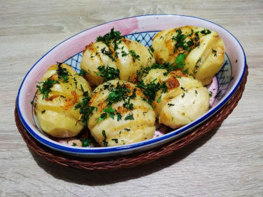 Через указанное время выньте форму из духовки и уберите фольгу. Силиконовой кисточкой смажьте каждый клубень ароматным маслом.