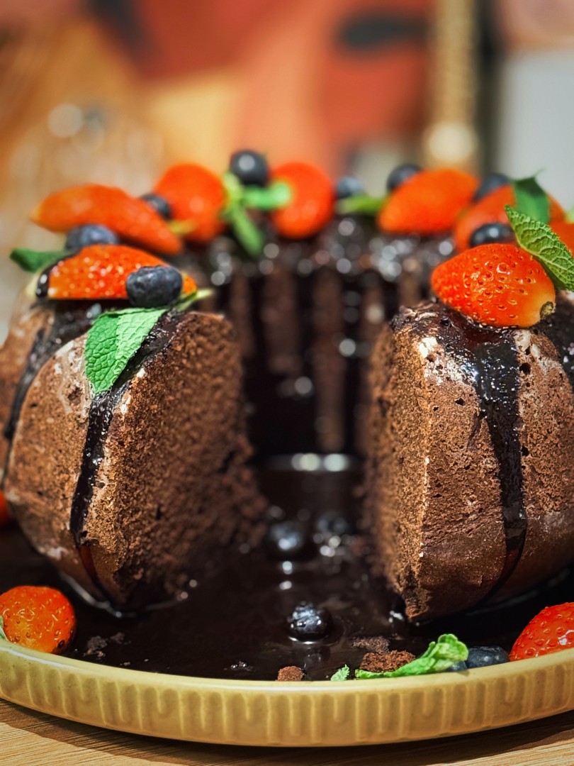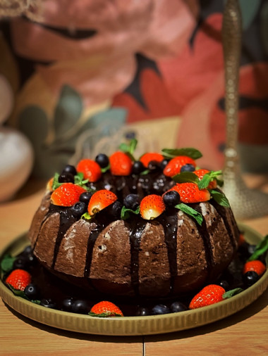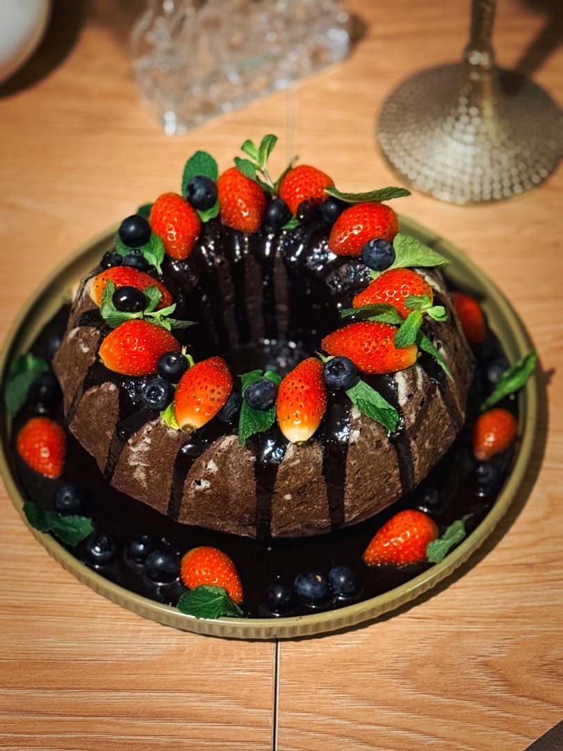 Полейте кекс теплой шоколадной глазурью. Украсьте ягодами и мятой и подайте к столу. Приятного аппетита!