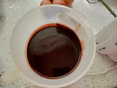 В остывшую шоколадную смесь по одному добавьте яйца, взбивая массу после каждого. Очень важно тщательно взбить яйца - это залог того, что кекс хорошо поднимется и получится воздушным. Можете сначала взбить до пышности яйца, а потом добавить в них шоколадно-масляную смесь.