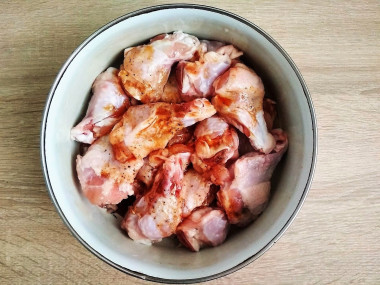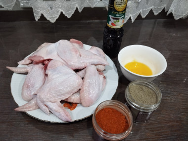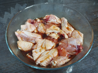 Все подготовленные крылышки выложите в чашу с маринадом и все хорошо перемешайте. Маринад должен равномерно покрывать крылышки со всех сторон. Оставьте крылья на 1-2 часа постоять, промариноваться.