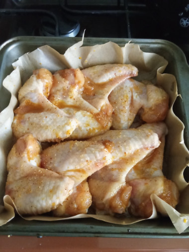 Для запекания можно взять любую жаропрочную форму или противень. Выложите на противень крылышки вместе с маринадом и поставьте в духовку, предварительно разогретую до 180 градусов, на 1 час. При запекании ориентируйтесь по своей духовке.