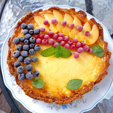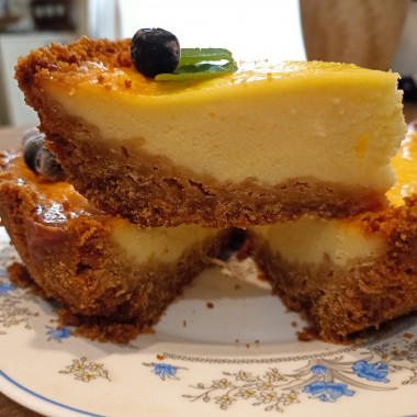 Это мой первый опыт в приготовлении чизкейка. У нас в семье не жалуют творог, а тут такой рецепт-находка. Печенье измельчила, как и автор, в пакете скалкой, масло растопила в СВЧ. Сметаны в магазине 25% не оказалось, купила 20%, а вот крахмал у меня был картофельный. Первый блин оказался комом, неравномерно распределилась основа по форме, вроде когда утрамбовывала, всё казалось ровно, а в разрезе..., ну как получилось. Выпекался в моей духовке чизкейк один час, потом отставила его там до полного остывания, только чуть приоткрыла дверцу, подложив под неё деревянную лопатку. На ночь убрала в холодильник. Очень переживала, что при нарезке рассыпется основа. И вот он, долгожданный момент дегустации. Это просто волшебство!!! Основа хорошо держит форму, а крем - это сказочное наслаждение! Мы вкушали его , закрыв глаза, и просто наслаждались нежностью. Кроме того, что это восторг, говорить ничего не буду. Рекомендую приготовить это великолепный десерт, тем более, что это очень просто и быстро. Наша сердечная благодарность автору этого праздника вкуса и хорошего настроения!