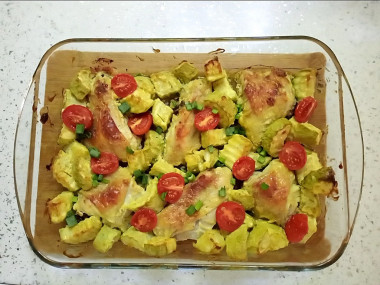 Для запекания подойдет любая жаропрочная форма. Я буду запекать в керамической форме. Выложите в форму курицу с кабачками и маринадом. Я выложила большую часть кабачков на дно формы. Затем разложила курочку и в промежутки остатки кабачков.