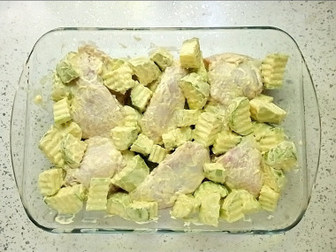 Сюда же добавьте куриные голени. Все ингредиенты перемешайте, чтобы сметанный маринад покрывал курицу и кабачки со всех сторон. Оставьте все постоять на 1 час.