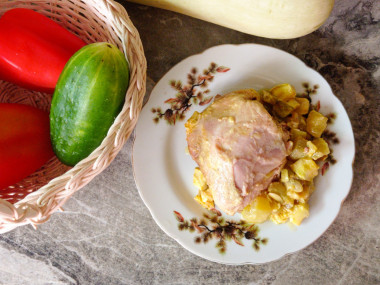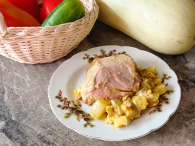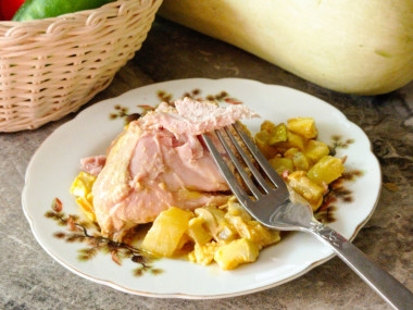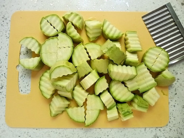 У меня было три куриных бедра, которые я разделила пополам. Молодые кабачки нарезала фигурным ножом на довольно крупные кусочки.