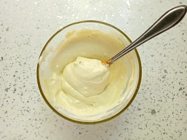 В просторной чаше соедините сметану и горчицу. Добавьте куркуму, соль и специи. В качестве специи я беру смесь молотых перцев.