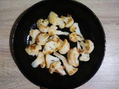 В сковороде на среднем огне разогрейте растительное масло. Выложите подготовленную цветную капусту и обжарьте, помешивая, до появления легкой румяной корочки около 10-15 минут до готовности. Точное время зависит от степени нагрева и размера соцветий. Как выбрать сковороду и масло для жарки читайте по ссылкам в статьях на эти темы, в конце рецепта.