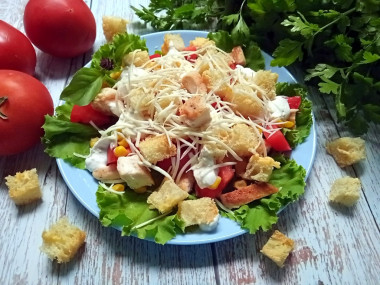 Салат с гренками я делала с особым чувством. Сын закрыл сессию и салат был приготовлен по этому поводу. Ему салат очень понравился, ведь там и сухарики сырные, и курочка жареная, и сладкая кукуруза. Да еще свежие, сочные помидорки! Сухарики для салата запекла с сыром маасдам. Они получились очень вкусными и ароматными, возьму на заметку, буду делать такие к первым блюдам. А куриную грудку замариновала в паприке и чёрном перце минут на 10 и обжарила на сильном огне. Для заправки у меня не было зернистой горчицы. Поэтому добавила к майонезу немного обычной русской горчицы и щепотку зёрен горчицы. Сыну нравится как они хрустят) Кстати мёд оказывается даёт интересный приятный привкус. Салат очень вкусный. Спасибо за рецепт!
