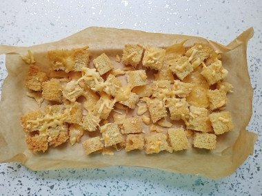 Разогрейте духовку до 160°С. Противень застелите пергаментом, разложите на него кубики хлеба в один ряд. Сбрызните их каплей оливкового масла. Сверху потрите на хлеб немного твердого сыра.