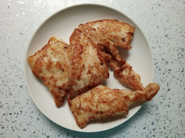 Разогрейте на сковороде на сильном огне растительное масло без запаха. Выложите в него кусочки курицы. Обжаривайте ее до румяности с обеих сторон по 5 минут. Готовую курицу снимите со сковороды и остудите.