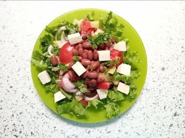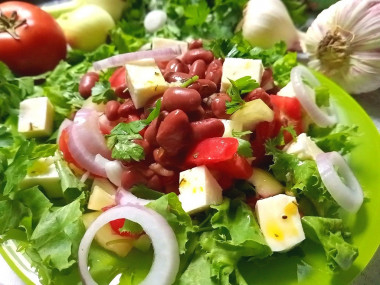 На днях увидела в ленте рецепт салата с фасолью консервированной и сыром, меня так впечатлили красочные фотографии, что срочно захотелось приготовить такой же. Только меня озадачило то, что используется маринованная стручковая фасоль. Я такую в продаже не видела. Поэтому по совету автора заменила на обычную фасоль. Листья салата нарезала для удобства. Помидорки выбрала сочные, спелые, мне нравится вкусный сок от салата, который образуется после соединения овощей с заправкой. Сыр у меня в виде рассольной брынзы. Раньше его в такие салаты не добавляла, а зря, получается очень вкусно! Фасоль мариновать в уксусе и чесноке не стала, ведь она самая обыкновенная) Зато смешала все это с ароматным горчичным маслом и полила салат этой заправкой. Этот салат больше всего понравился мне и мужу, мы любим сочетание помидоров, лука и чуть кисленькой заправки. А тут еще столько дополнений) Отличный салат для ужина!