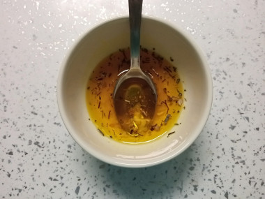 Фасоль слегка посолите и полейте уксусом. Я использовала уксус на травах 5%. Всё перемешайте и оставьте промариноваться 5-10 минут.