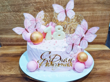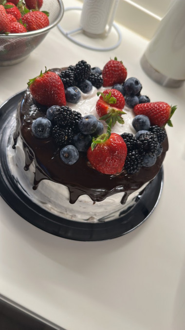 Так соберите торт. Верх и бока торта смажьте отложенным 1/3 крема. Уберите торт в холодильник на 5-6 часов, чтобы он пропитался и крем застыл. В целом, торт готов! Внешний вид можно оформить по своему желанию.