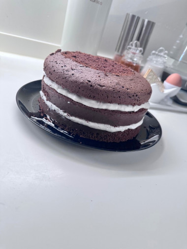 Бисквит получился удачный,пористый,который разрезала на три коржа. Собрала торт: бисквит, пропитка из сладкой воды, крем,бананы,порезанные колечками. Торт убрала на ночь для пропитки и стабилизации. Для финишного покрытия торта добавила в крем творожный сыр и каплю красителя.