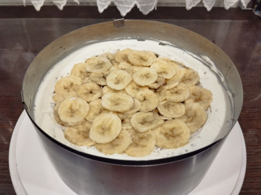 Смешайте с бананами 2/3 крема. Я люблю делать в торт вот такой вот банановый крем с небольшими кусочками бананов. Но можно просто прослаивать коржи кремом из сливок, а бананы выкладывать нарезанными кружочками.