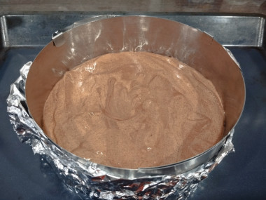 Дно формы для выпечки застелите пергаментом и немного смажьте растительным маслом. Бока смазывать не надо. Готовое тесто перелейте в форму (18-20 см) и поставьте в духовку, предварительно разогретую до 180 градусов, примерно на 40-50 минут. Ориентируйтесь по своей духовке.