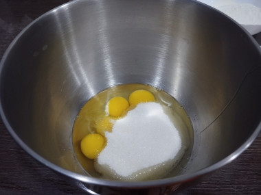 Для приготовления бисквита соедините яйца с сахаром и взбивайте на максимальной скорости миксера до получения пышной белой массы. Время взбивания будет зависеть от мощности миксера. Ориентируйтесь на пышность массы. Взбитые яйца густо стекают с венчика.