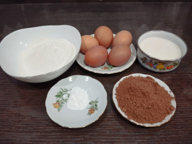 Муку соедините с какао и содой. Все просейте через сито. Мучную массу вмешайте к взбитым яйцам. Делайте это вручную, с помощью венчика, чтобы масса оставалась пышной. Готовое тесто не жидкое и не густое.