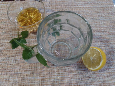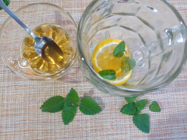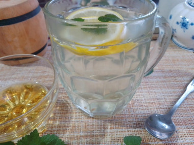 Летом наверняка эту водичку лучше пить охлаждённую, а вот осенью пить ее теплой в самый раз! Я делала меньший объем на 0,5 литров. В кружку положила два не тоненьких кружка лимона слегка помяла их ложкой, чтобы они пустили сок. Добавила две чайные ложки меда и листики мелиссы, можно и мяту взять. И залила все это, как в рецепте, в меру горячей водой. Дала пару минут постоять, раствориться мёду, всё хорошо перемешала и можно пить!