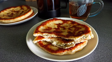 . Вот рецепт сырных лепёшек на кефире на сковороде подходит идеально. По ингредиентам муки у меня ушло всего на 10 граммов больше указанного, но все остальное, как говорится, строго по списку. Вместе с адыгейским сыром был сыр мраморный. Кефир у нас свой, на закваске. Разделила я все так же на 8 частей. Формировать лепешки очень просто, тесто изумительное, податливое и нежное. При этом эластичное, не рвалось при раскатывании уже с начинкой. Количество начинки, на мой взгляд, соответствует количеству теста. Отлично! У меня так получилось, что пока выпекалась первая лепешка, я раскатала уже и все остальные семь