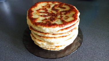 Готовые сырные лепешки выложите на тарелку горкой, чтобы они дольше оставались теплыми. У меня получилось 8 лепешек диаметром примерно 10 см.