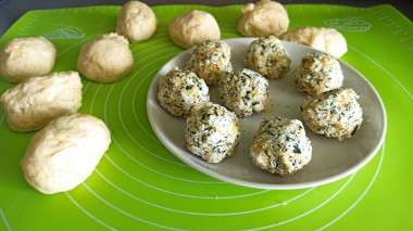 Из начинки скатайте шарики по количеству кусочков теста. Сырная масса легко лепится.