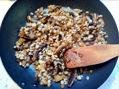 Выложите к грибам перловку, добавьте чеснок, пропущенный через пресс и все перемешайте. Прогрейте все вместе еще 2-3 минуты.