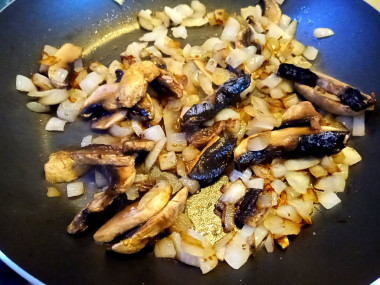В сковороду к луку выложите подготовленные грибы, перемешайте и обжаривайте все вместе 5-7 минут, чтобы грибы начали подрумяниваться. Немного их подсолите и посыпьте любимыми специями.