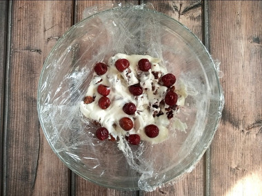 Затяните миску пленкой и поставьте торт на 6-8 часов в холодильник.